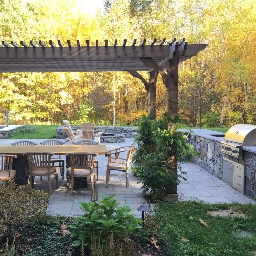 One primary use of pergolas is to create shade. Along with providing extra shade, pergolas can expand the use of a backyard patio and extend the amount of time during the year that space can be used. Landscape designers will incorporate a pergola in your design to frame an outdoor living room as an extension for your indoor living space. Many outdoor kitchens incorporate some type of patio cover to frame in the outdoor kitchen area. Pergolas can provide some shelter that protects you from the sun and heat, but that also allows some natural light and breeze to filter through one of your favorite outdoor spaces. Natural covers like wisteria, or a canopy provide additional protection from the sun and light rain.