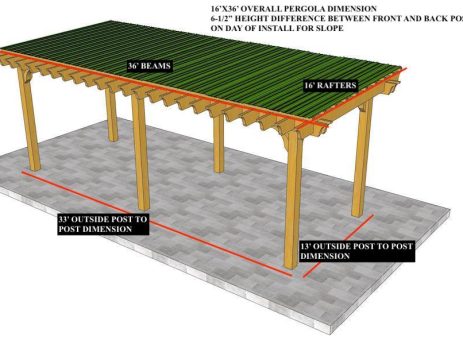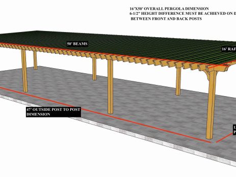 15'X50' OVERALL PERGOLA DIMENSION 12'X47' OUTSIDE POST TO POST DIMENSION Pergola Depot custom pergola kit. This kit includes standard shipping, installation instructions, and the following pergola components: 6x6 posts 2x8 mortised rafters On +/- 24" centers 2x8 double beams 6x6 posts 2x2 top slats On 12" centers 2x6 angle braces 2×8 ledger board (for attached pergola kits only) Stainless steel hardware Optional post mounting hardware (ABU66RZ or ABU66Z) Optional post base trim Important notes: - Upon delivery (2) or more adults are required to inspect and unload the kit piece by piece from the back of the truck. This will take approximately 15-30 minutes for kits up to 20x20. DO NOT unload the kit using a forklift. - Pine Kits: Pressure Treated Pine must be assembled first and allowed to dry 3-4 months before staining...