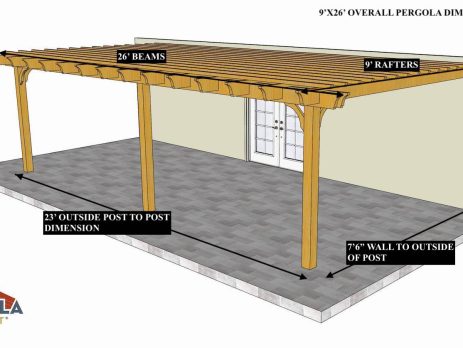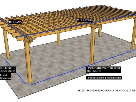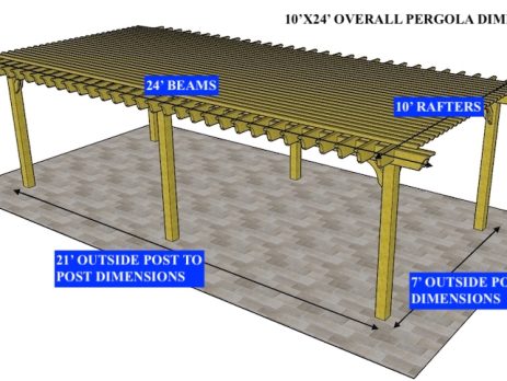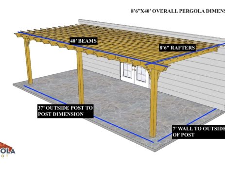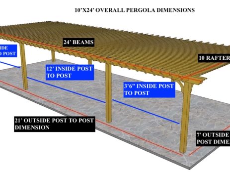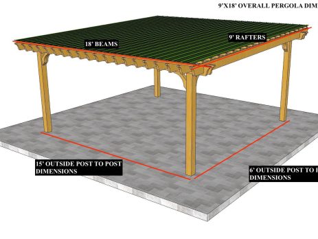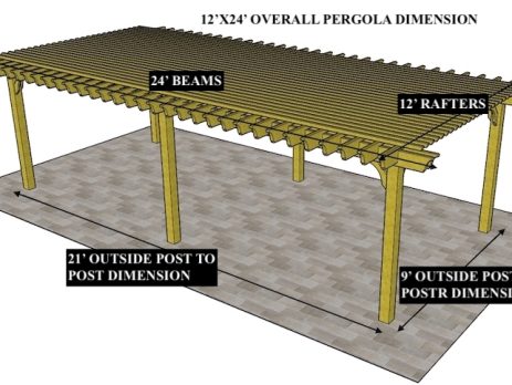 12'X24' OVERALL PERGOLA DIMENSION 9'X21' OUTSIDE POST TO POST DIMENSION Pergola Depot custom pergola kit. This kit includes standard shipping, installation instructions, and the following pergola components: 6x6 posts 2x8 mortised rafters 2x8 double beams 2x2 top slats 2x6 angle braces 2×8 ledger board (for attached pergola kits only) Stainless steel hardware Optional post mounting hardware (ABU66RZ or ABU66Z) Optional post base trim Important notes: - Upon delivery (2) or more adults are required to inspect and unload the kit piece by piece from the back of the truck. This will take approximately 15-30 minutes for kits up to 20x20. DO NOT unload the kit using a forklift. - Pine Kits: Pressure Treated Pine must be assembled first and allowed to dry 3-4 months before staining or painting. DO NOT stain, seal, or paint pressure...
