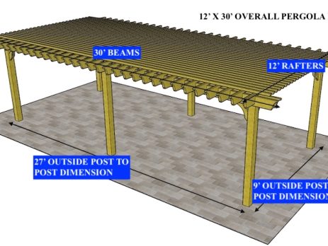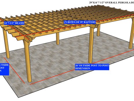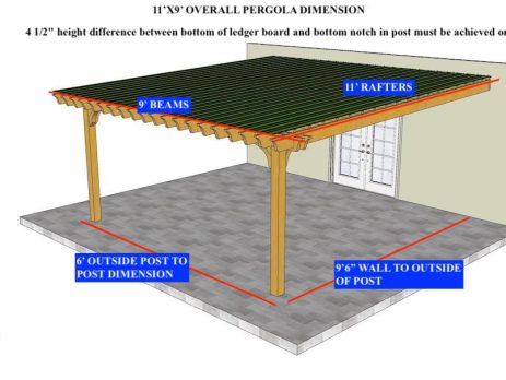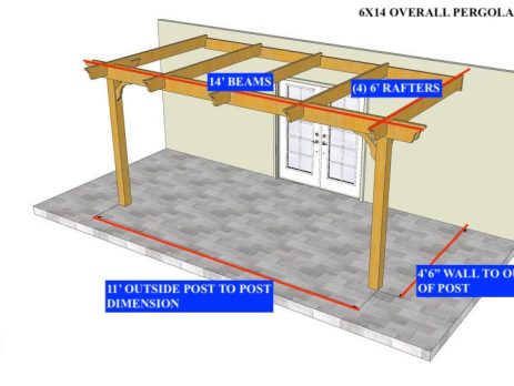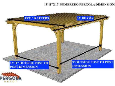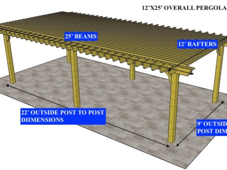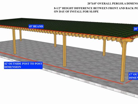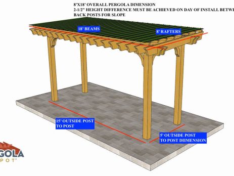 14'x23' OVERALL PERGOLA DIMENSION 12'6"X20' OUTSIDE POST TO POST DIMENSION 6" height difference between bottom of ledger board and bottom notch in posts must be achieved on day of install Pergola Depot custom pergola kit. This kit includes standard shipping, installation instructions, and the following pergola components: 2×8 double beams 2×8 mortised rafters 6×6 posts 4x6 angle braces 2x2 top slats Stainless steel hardware Optional galvanized post mounting hardware (ABU66RZ or ABU66Z) Optional MasterRib Metal Roofing Panels and Hardware NOTE: Installation requires customer (or representative) perform more advanced tasks Important notes: - Upon delivery (2) or more adults are required to inspect and unload the kit piece by piece from the back of the truck. This will take approximately 15-30 minutes for kits up to 20x20. DO NOT unload the kit using a forklift. - Pine...
