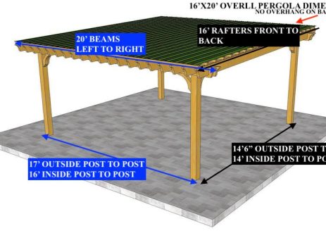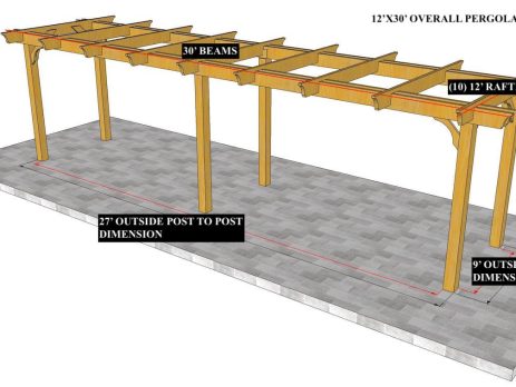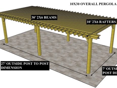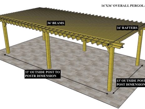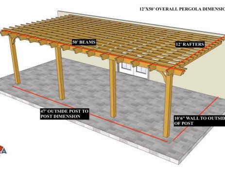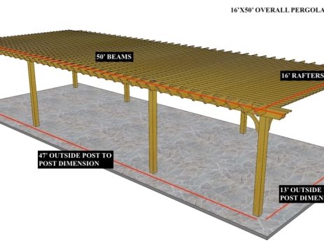 16'X50' OVERALL PERGOLA DIMENSION 13'X47' OUTSIDE POST TO POST DIMENSION Pergola Depot custom pergola kit. This kit includes standard shipping, installation instructions, and the following pergola components: 6x6 posts 2x8 mortised rafters 2x8 double beams 6x6 posts 2x2 top slats 2x6 angle braces 2×8 ledger board (for attached pergola kits only) Stainless steel hardware Optional post mounting hardware (ABU66RZ or ABU66Z) Optional post base trim Important notes: - Upon delivery (2) or more adults are required to inspect and unload the kit piece by piece from the back of the truck. This will take approximately 15-30 minutes for kits up to 20x20. DO NOT unload the kit using a forklift. - Pine Kits: Pressure Treated Pine must be assembled first and allowed to dry 3-4 months before staining or painting. DO NOT stain, seal, or...