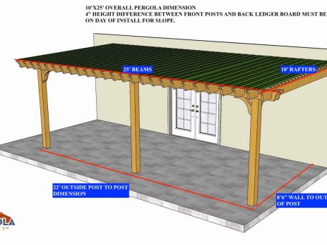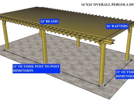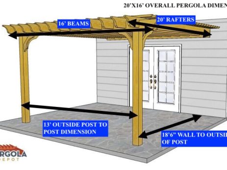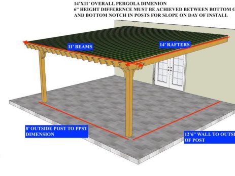 13'6"X15' OVERALL PERGOLA DIMENSION 12'X12' OUTSIDE POST TO POST DIMENSION Pergola Depot custom pergola kit. This kit includes standard shipping, installation instructions, and the following pergola components: 6x6 posts 2x8 mortised rafters 2x8 double beams 6x6 posts 2x2 top slats 2x6 angle braces 2×8 ledger board (for attached pergola kits only) Stainless steel hardware Optional post mounting hardware (ABU66RZ or ABU66Z) Optional post base trim Important notes: - Upon delivery (2) or more adults are required to inspect and unload the kit piece by piece from the back of the truck. This will take approximately 15-30 minutes for kits up to 20x20. DO NOT unload the kit using a forklift. - Pine Kits: Pressure Treated Pine must be assembled first and allowed to dry 3-4 months before staining or painting. DO NOT stain, seal, or...