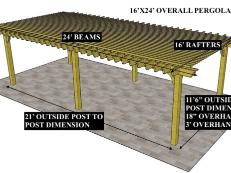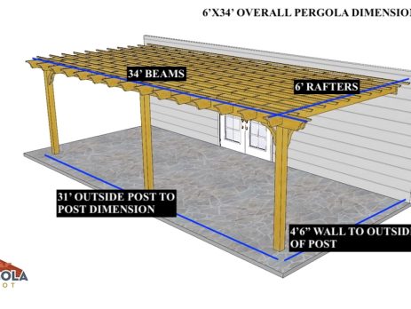 6'X34' OVERALL PERGOLA DIMENSION 4'6"X31' OUTSIDE POST TO POST DIMENSION Pergola Depot custom pergola kit. This kit includes standard shipping, installation instructions, and the following pergola components: 6x6 posts 2x8 mortised rafters 2x8 double beams 2x2 top slats 2x6 angle braces 2×8 ledger board (for attached pergola kits only) Stainless steel hardware Optional post mounting hardware (ABU66RZ or ABU66Z) Optional post base trim Important notes: - Upon delivery (2) or more adults are required to inspect and unload the kit piece by piece from the back of the truck. This will take approximately 15-30 minutes for kits up to 20x20. DO NOT unload the kit using a forklift. - Pine Kits: Pressure Treated Pine must be assembled first and allowed to dry 3-4 months before staining or painting. DO NOT stain, seal, or paint pressure...