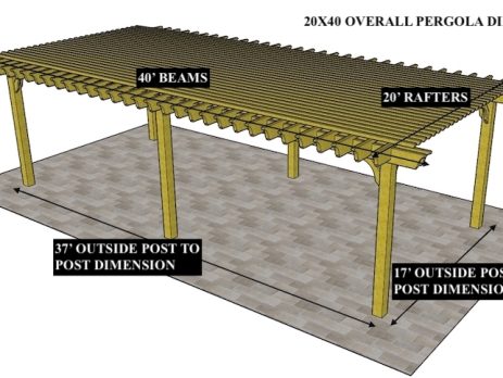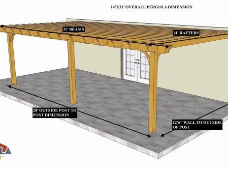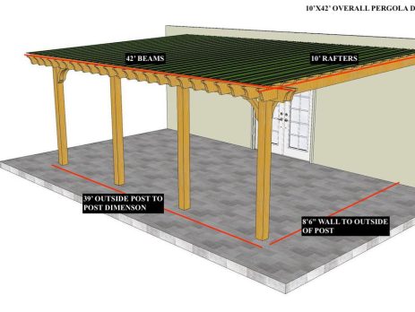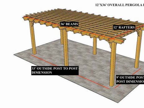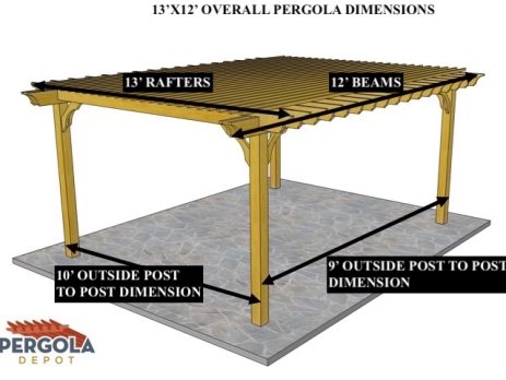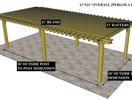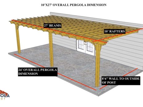 10'X27' OVERALL PERGOLA DIMENSION 8'6"X24' OUTSIDE POST TO POST DIMENSION Pergola Depot custom pergola kit. This kit includes standard shipping, installation instructions, and the following pergola components: 6x6 posts 2x8 mortised rafters 2x8 double beams 2x2 top slats 2x6 angle braces 2×8 ledger board (for attached pergola kits only) Stainless steel hardware Optional post mounting hardware (ABU66RZ or ABU66Z) Optional post base trim Important notes: - Upon delivery (2) or more adults are required to inspect and unload the kit piece by piece from the back of the truck. This will take approximately 15-30 minutes for kits up to 20x20. DO NOT unload the kit using a forklift. - Pine Kits: Pressure Treated Pine must be assembled first and allowed to dry 3-4 months before staining or painting. DO NOT stain, seal, or paint pressure...