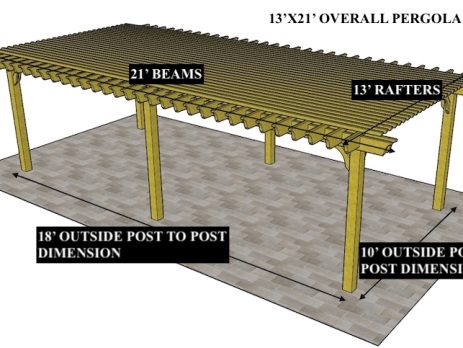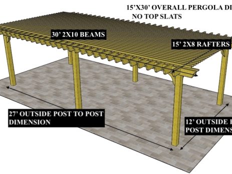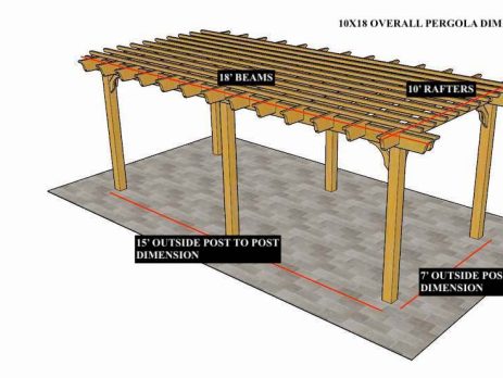 10'X18' OVERALL PERGOLA DIMENSION 7'X15' OUTSIDE POST TO POST DIMENSION Pergola Depot custom pergola kit. This kit includes standard shipping, installation instructions, and the following pergola components: 6x6 posts 2x6 mortised rafters 2x6 double beams 2x2 top slats 2x6 angle braces 2×8 ledger board (for attached pergola kits only) Stainless steel hardware Optional post mounting hardware (ABU66RZ or ABU66Z) Optional post base trim Important notes: - Upon delivery (2) or more adults are required to inspect and unload the kit piece by piece from the back of the truck. This will take approximately 15-30 minutes for kits up to 20x20. DO NOT unload the kit using a forklift. - Pine Kits: Pressure Treated Pine must be assembled first and allowed to dry 3-4 months before staining or painting. DO NOT stain, seal, or paint pressure...