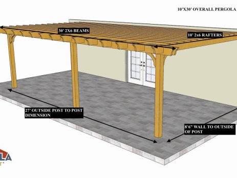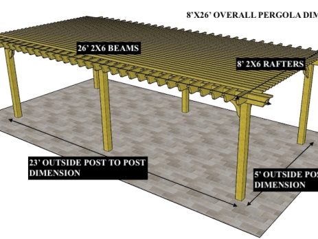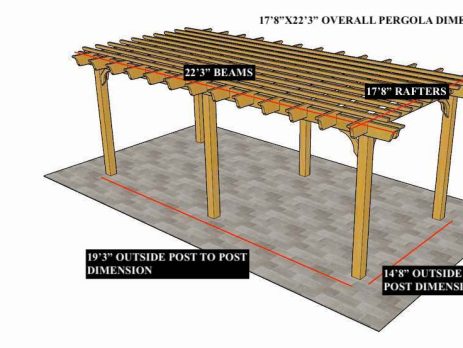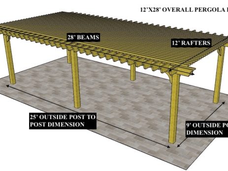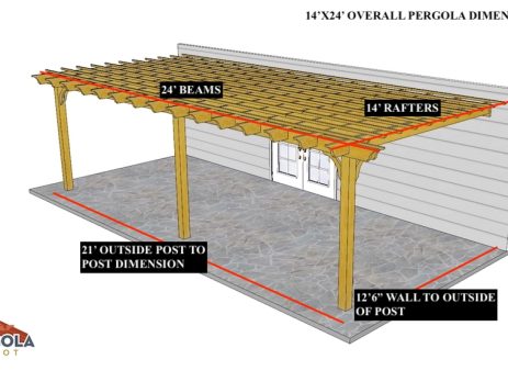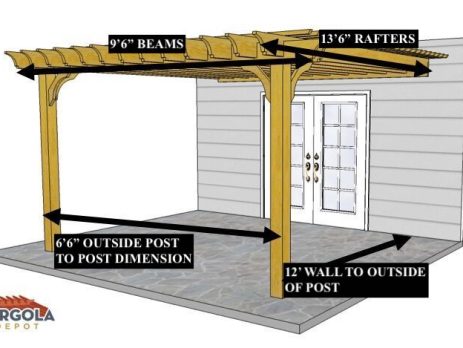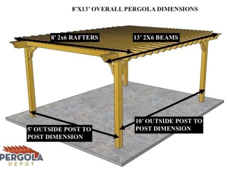 8'X12'9" OVERALL PERGOLA DIMENSION 6'6"X9'9" OUTSIDE POST TO POST DIMENSION Pergola Depot custom pergola kit. This kit includes standard shipping, installation instructions, and the following pergola components: 6x6 posts 2x8 mortised rafters 2x8 double beams 6x6 posts 2x6 angle braces 2×8 ledger board (for attached pergola kits only) Stainless steel hardware Optional post mounting hardware (ABU66RZ or ABU66Z) Optional post base trim Important notes: - Upon delivery (2) or more adults are required to inspect and unload the kit piece by piece from the back of the truck. This will take approximately 15-30 minutes for kits up to 20x20. DO NOT unload the kit using a forklift. - Pine Kits: Pressure Treated Pine must be assembled first and allowed to dry 3-4 months before staining or painting. DO NOT stain, seal, or paint pressure treated...