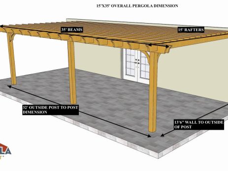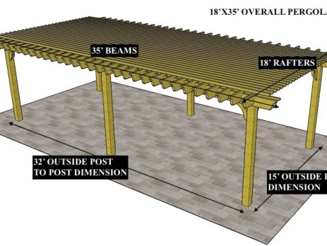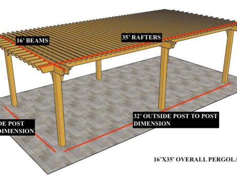 16'X35' OVERALL PERGOLA DIMENSION 13'X32' OUTSIDE POST TO POST DIMENSION Pergola Depot custom pergola kit. This kit includes standard shipping, installation instructions, and the following pergola components: 6x6 posts 2x8 mortised rafters 2x8 double beams 6x6 posts 2x2 top slats 2x6 angle braces 2×8 ledger board (for attached pergola kits only) Stainless steel hardware Optional post mounting hardware (ABU66RZ or ABU66Z) Optional post base trim Important notes: - Upon delivery (2) or more adults are required to inspect and unload the kit piece by piece from the back of the truck. This will take approximately 15-30 minutes for kits up to 20x20. DO NOT unload the kit using a forklift. - Pine Kits: Pressure Treated Pine must be assembled first and allowed to dry 3-4 months before staining or painting. DO NOT stain, seal, or...