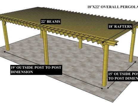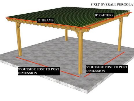 8'X12' OVERALL PERGOLA DIMENSION 5'x9' OUTSIDE POST TO POST DIMENSION 2-1/2" height difference between front and back posts must be achieved on day of install for slope Pergola Depot custom pergola kit. This kit includes standard shipping, installation instructions, and the following pergola components: 2×8 double beams 2×8 mortised rafters 6×6 posts 4x6 angle braces 2x2 top slats Stainless steel hardware Optional galvanized post mounting hardware (ABU66RZ or ABU66Z) Optional MasterRib Metal Roofing Panels and Hardware NOTE: Installation requires customer (or representative) perform more advanced tasks Important notes: - Upon delivery (2) or more adults are required to inspect and unload the kit piece by piece from the back of the truck. This will take approximately 15-30 minutes for kits up to 20x20. DO NOT unload the kit using a forklift. - Pine Kits: Pressure Treated...